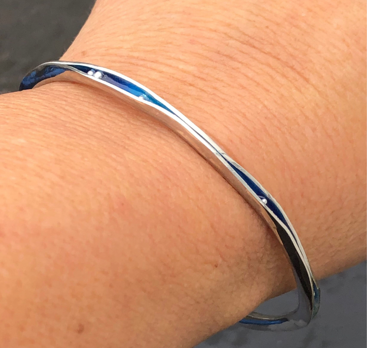 Sterling silver freeform bangle with beautiful blue enamels with Fine Silver bubbles detail. IMG_9330