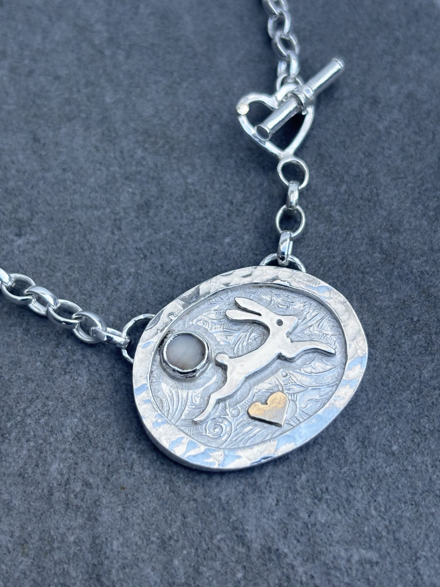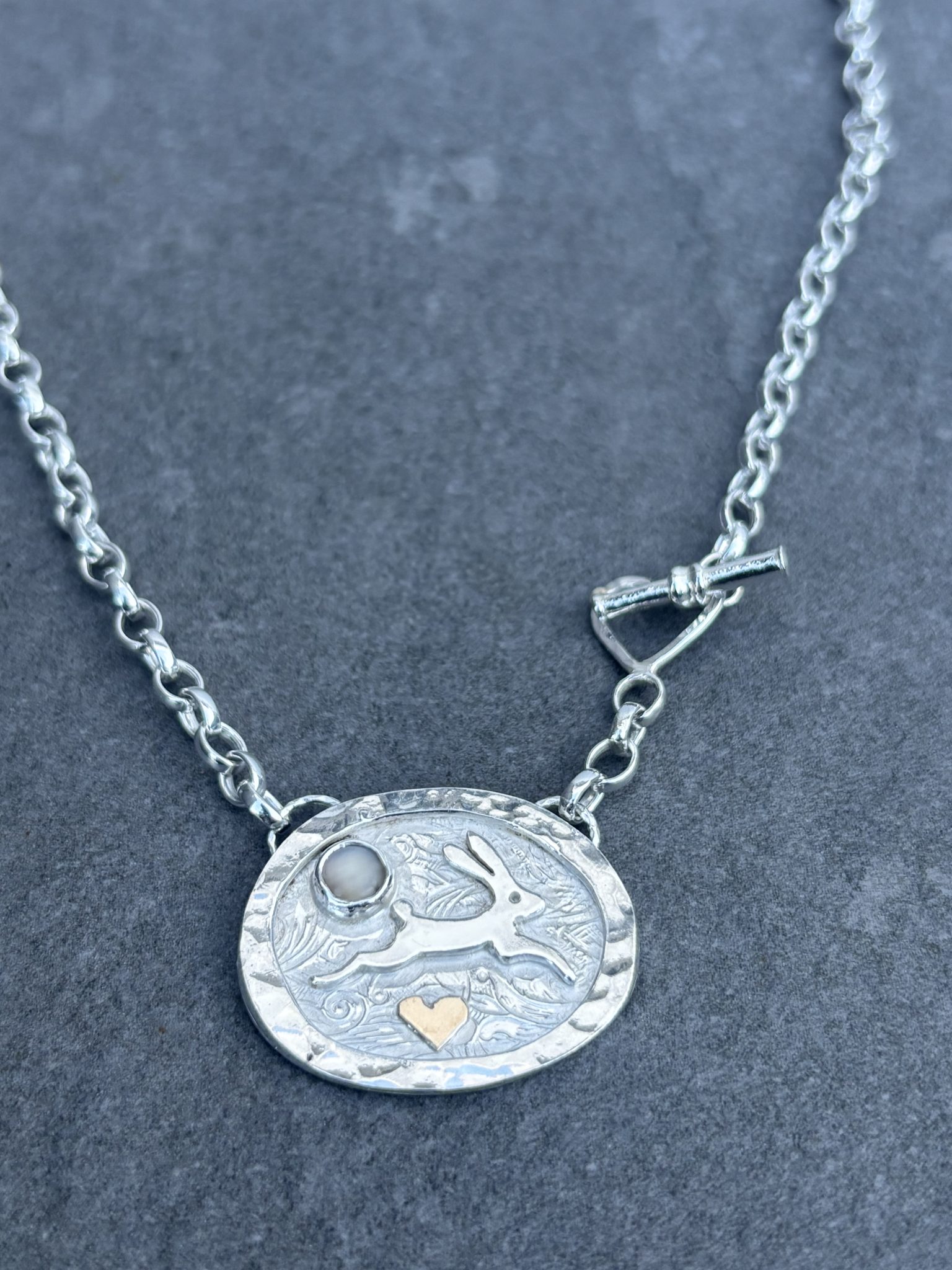 Silver Hare Necklace Sterling Silver Necklace with Moonstone, jumping silver hare and 9ct yellow gold heart.