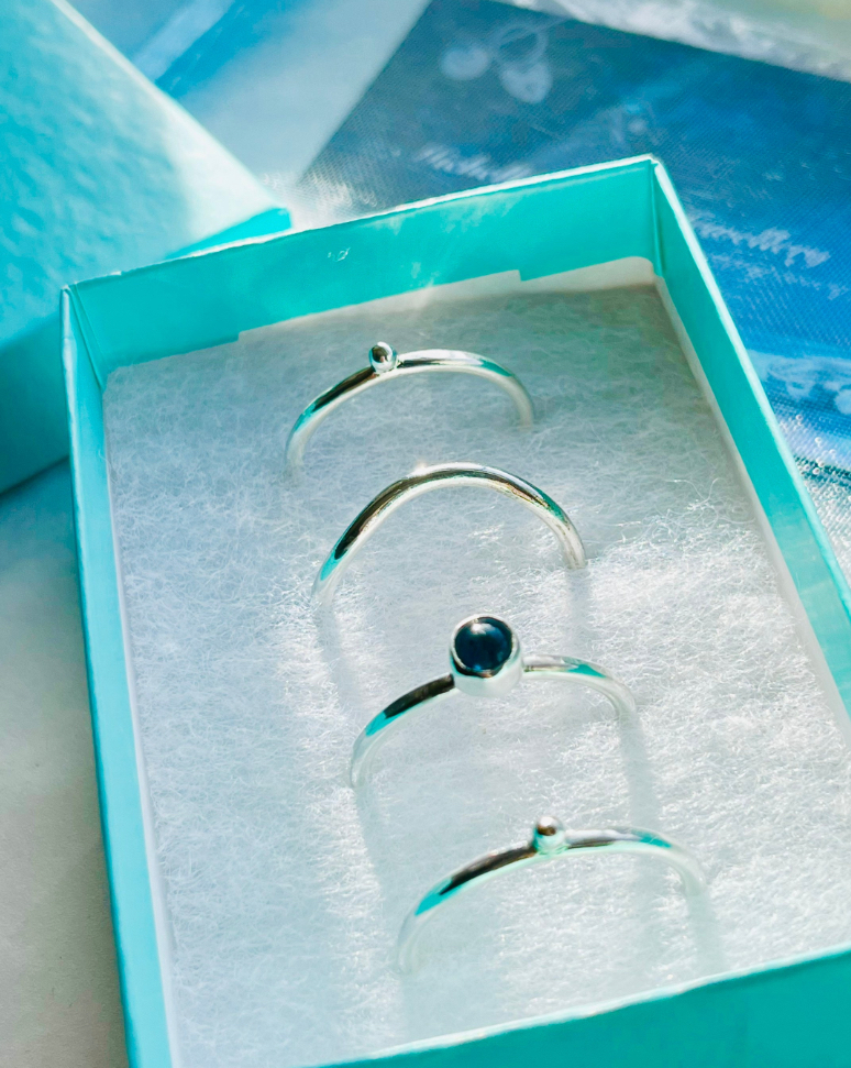 These four Sterling Silver rings sit together and remind of waves on the ocean. There are two silver water drop rings, a wave ring and a ring featuring a 5mm London Blue Topaz.