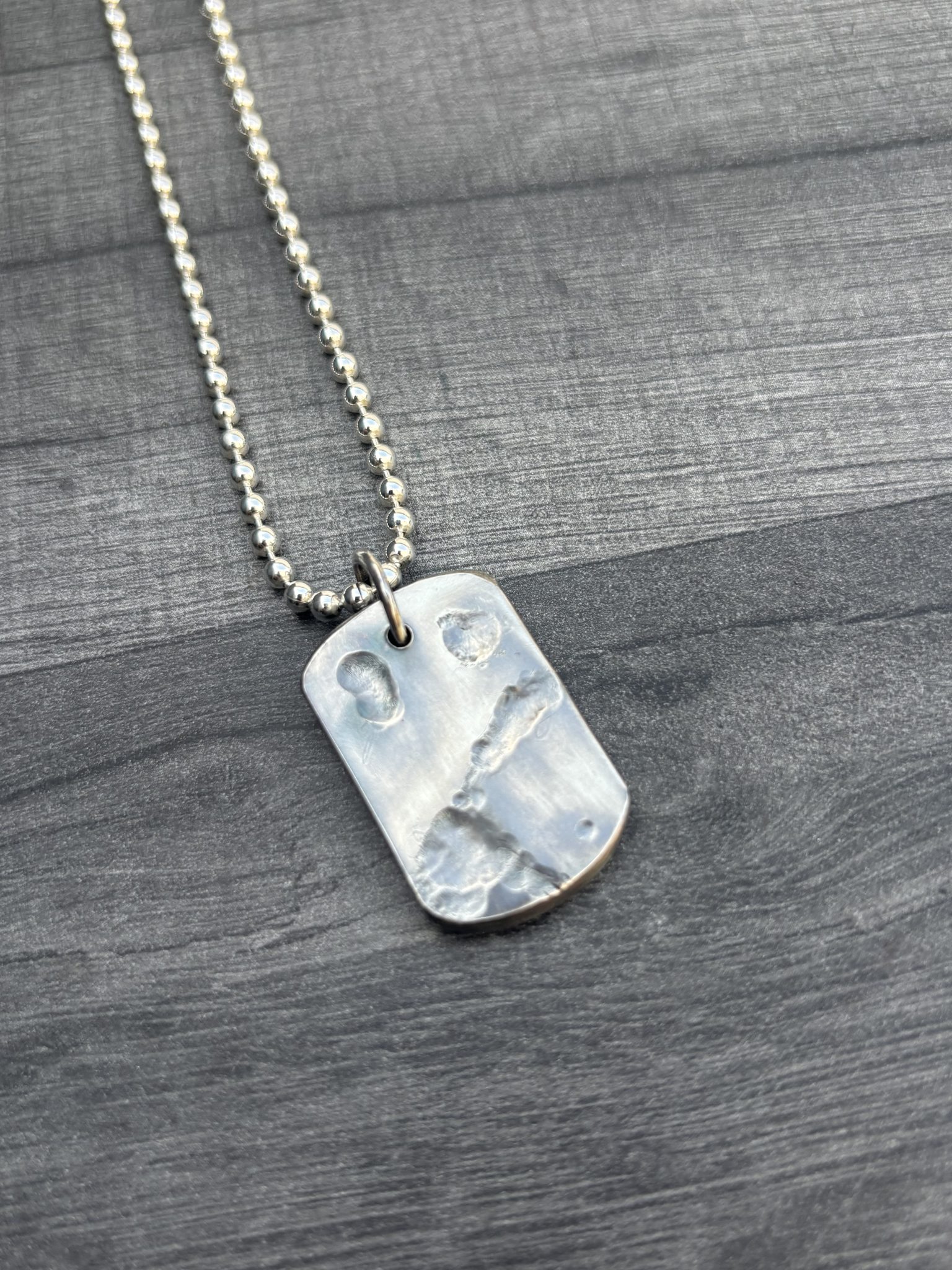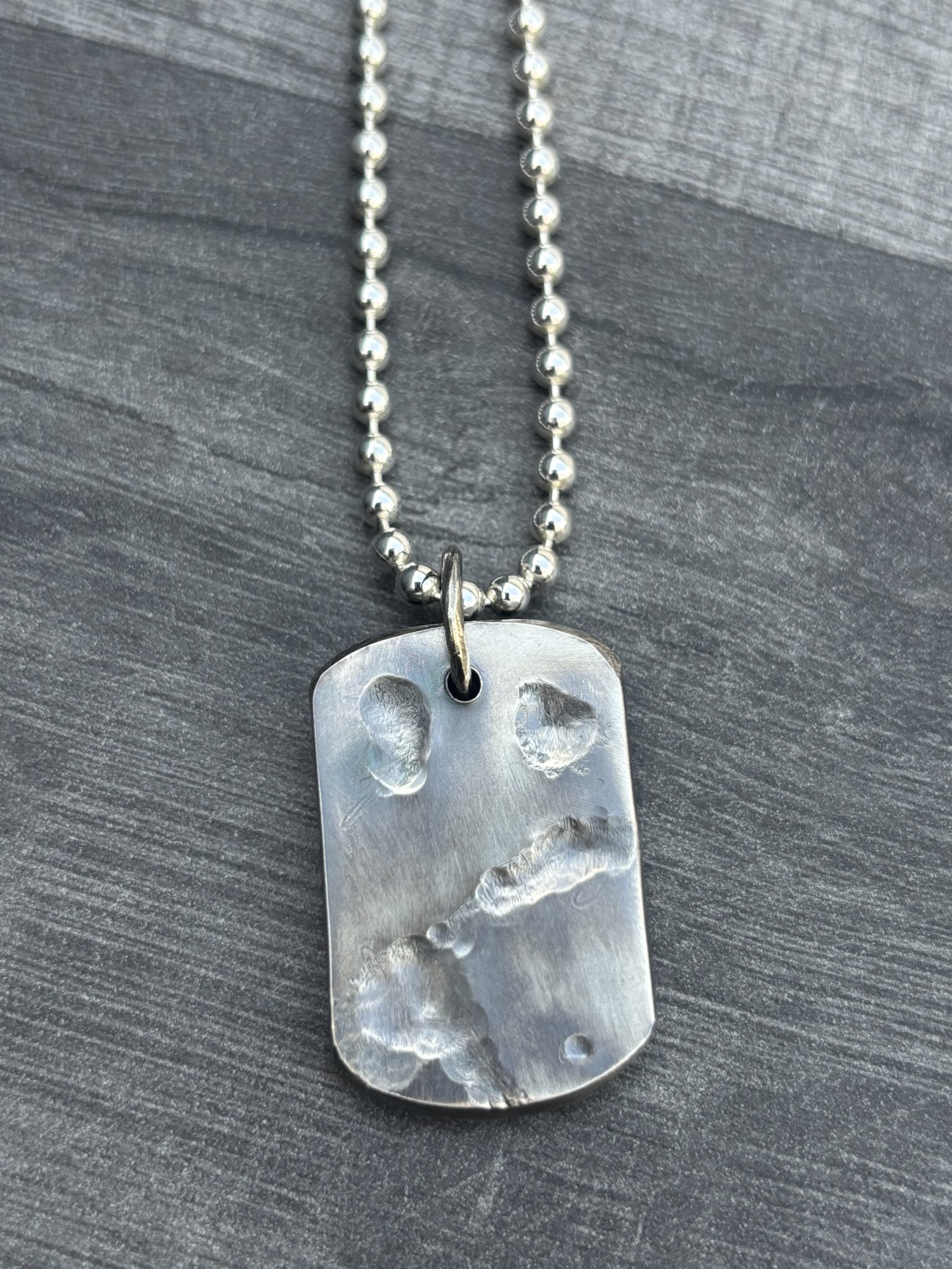 This Silver dog tag necklace is made from solid Sterling Silver. The tag has been hammered to give the appearance of dents and measures approximately: 3 x 2cm in size with a thickness of approximately 3.5mm. The Sterling Silver ball bead chain is approximately: 3mm in thickness with a length of 20 inches. The necklace has a high polished finish. If you require a longer chain please let me know at Checkout in the Notes section under your shipping info. This piece is hallmarked so please leave an extra week.