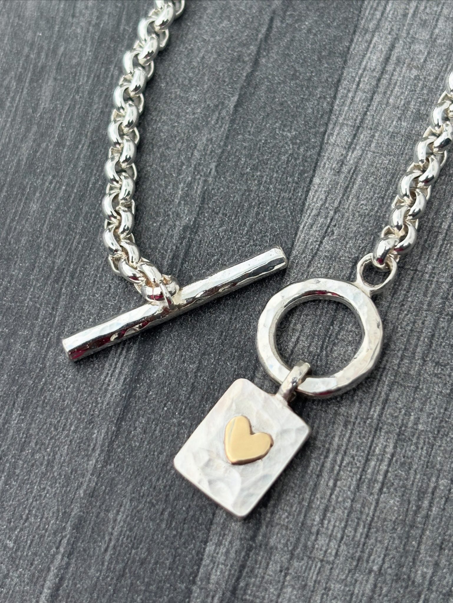 Silver Fob Necklace, silver t bar necklace, gold heart charm necklace, gift for her, gift for girlfriend, gift for valentines, gift for Christmas, sterling silver toggle necklace, silver and gold necklace, mixed metals necklace, gold heart necklace,