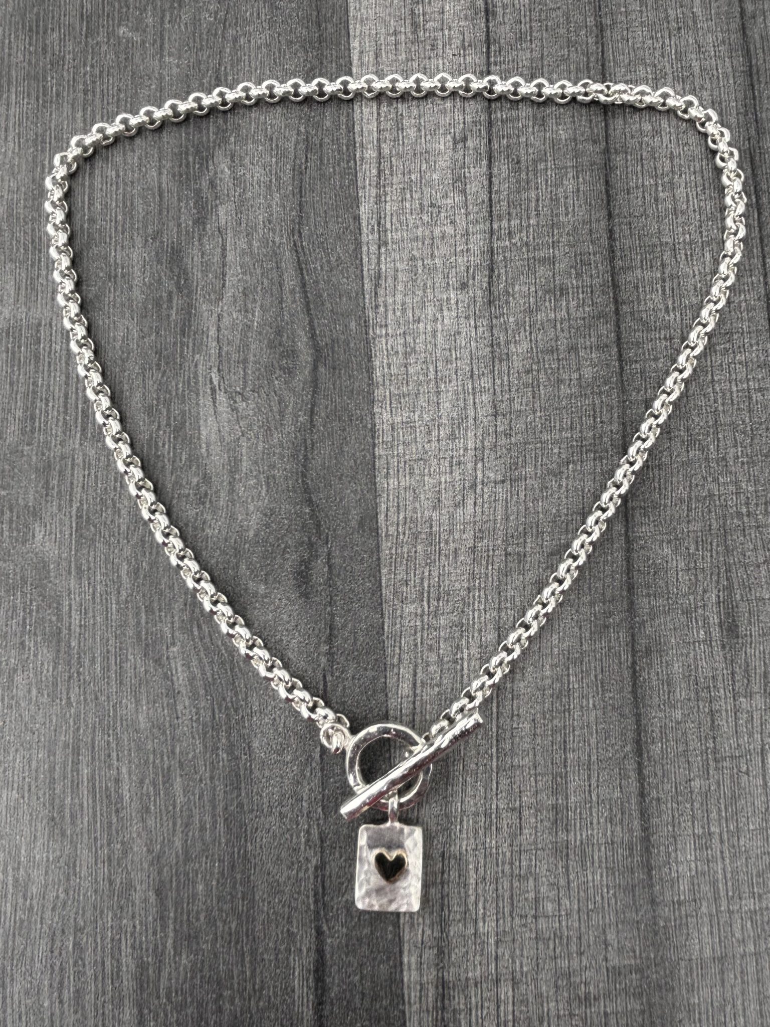 Sterling Silver Fob Necklace with Gold Heart rectangular hammered charm.