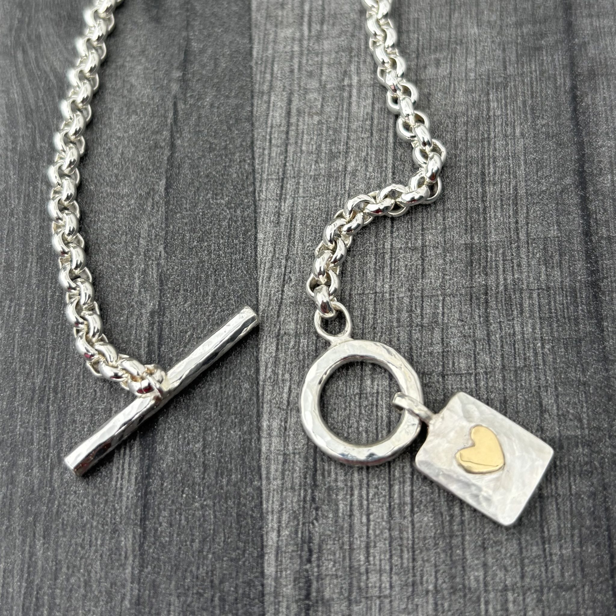 This Silver Fob Necklace has been handcrafted from solid Sterling Silver and solid 9ct yellow gold. The shiny belcher chain length is approximately :16.5 inches in length and each solid round link has a 4.5mm wide diameter. The 3mm wide, hammered t bar and the 2.5mm thick, hammered ring interlock. Hanging from the ring is a hammered, satin finished, rectangular charm which features a shiny, solid 9ct yellow gold heart in the centre.