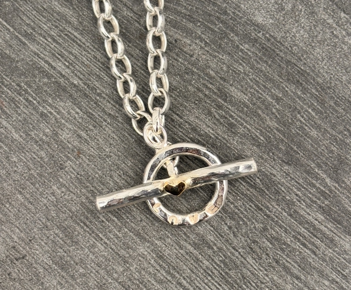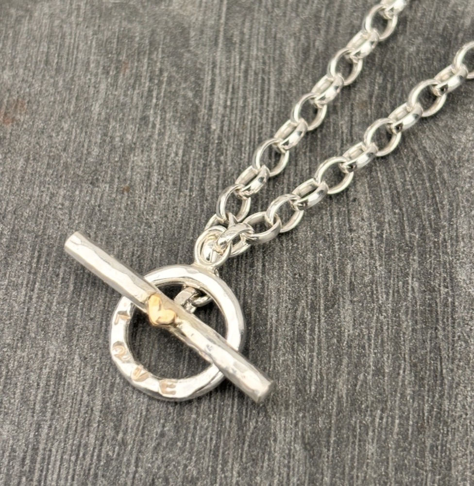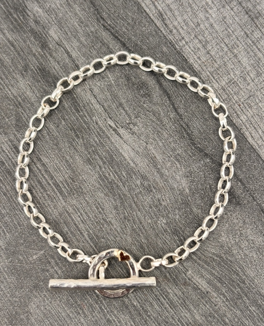 Sterling Silver Fob bracelet with hammered toggle clasp. Features a solid 9ct gold heart.